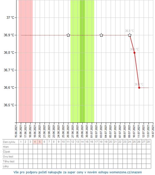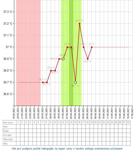 20.5. Byla menstruace skončila 25.5. A začla jse měřit teplota. 31.5. byl sex 1.6. ovulace a 3.6. sex opět. Mám příznaky bolesti zad, podbřišku, pocit, že to dostanu, motani a migrénu hlavy, nevolnosti, zácpu, časté močení, velká únava větší než obvykle, navíc dělám teď noční a ve skladu usínám, beru Femibion 1,velky hlad a chutě, bolest a citlivost prsou. Na testy je brzi zatím ms má přijít okolo 15.6. Byla by tu nějaká naděje? V tuhle chvíli to nikdo jeurci je to buď a nebo. Budu se v práci šetřit ať se má možnost zavrtat, pokud tam něco je. Jinak teď klesla teplota, ale zase stoupla tak snad už neklesne. Graf je podobný grafu z druhého těhotenství tak uvidíme.