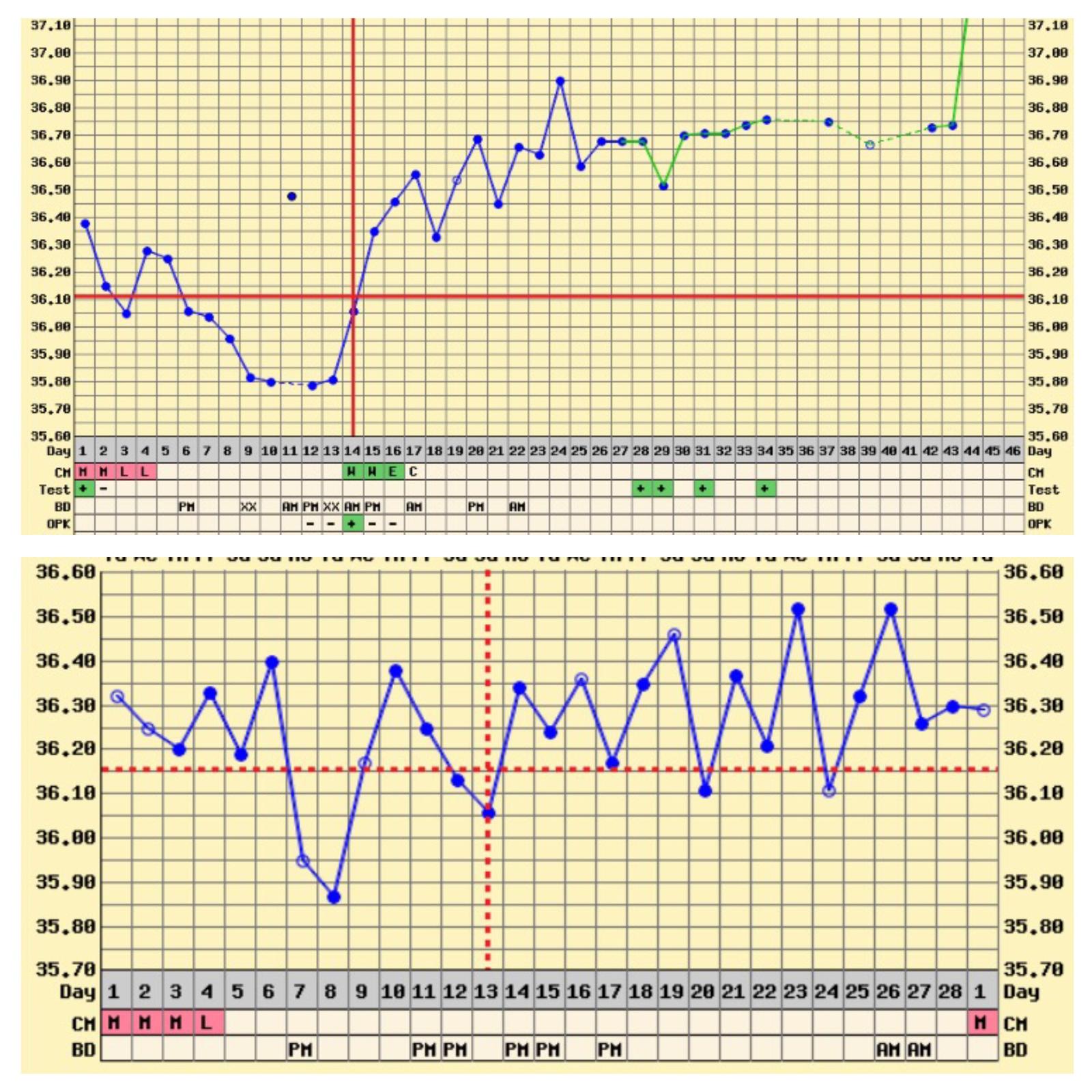 Ahoj holky, jdu si pro radu. Aplikace mi sice ovulaci vyznacila, ale ja si nejsem jista, zda-li vubec probehla vzhledem k malemu rozdilu teplot pred a po. Pritom pri prvnim otehotneni byl skok teplot evidentni (viz horni graf z lonska). Mate nekdo take tak male vykyvy a pritom ovulace probiha? A je vubec mozne mit tak rozdilne grafy?