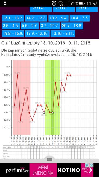 @ywushka take bych rekla, ze mohla byt 3 dny zpatky. Ale spis to ukaze dalsi mereni. Klidne ti muze vystoupat jeste mnohem vys, coz by mohlo znamenat, ze ovu teprve bude. Zalezi, jak velke mas teplotni vykyvy.