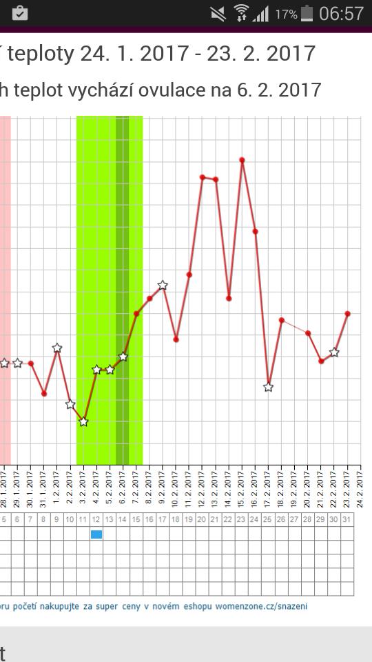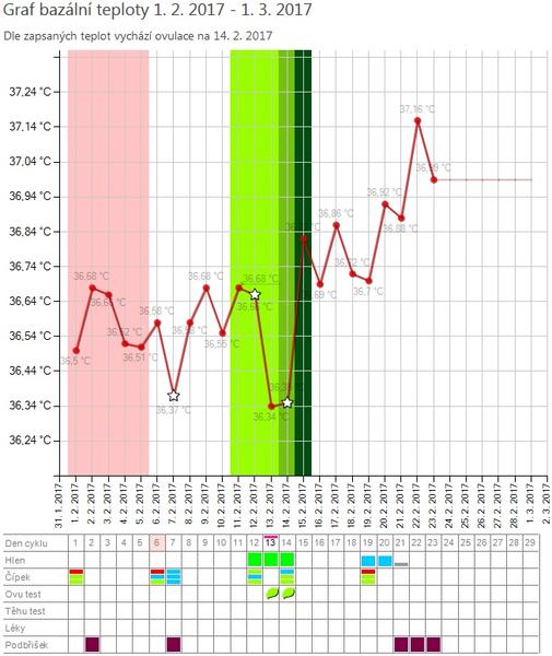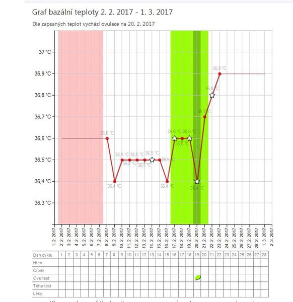 @lupati tuhle aplikaci neznám, ale ovu to vyznačilo 2.2.2017? to si myslím že ale podle teplot není dobře. ...kdyby to bylo 4.2.2017 tak bys byla dnes 16dpo a to by na testu nebo v krvi rozhodně něco bylo......ale taky to mohlo být 10.2. a to bys byla cca 10dpo ...............takhle to spíš vypadá že se ti prodloužil cyklus ale můžeš zkusit test zase ráno pokud ti neklesne teplota