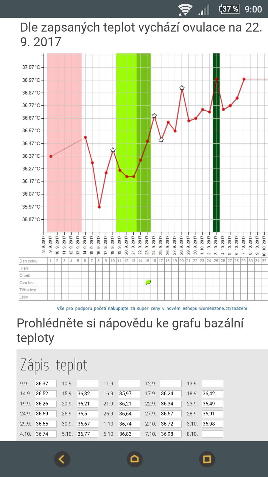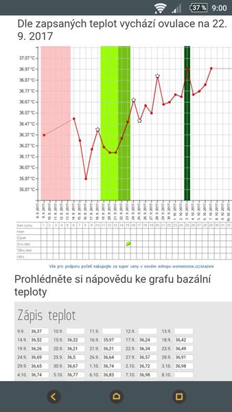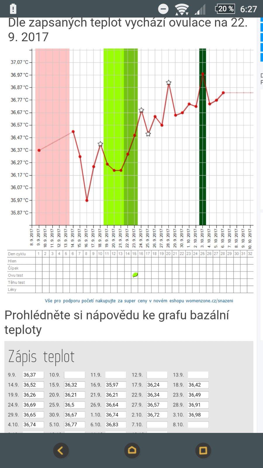 @fanunka To je zvláštní, že program ovulaci neukazuje - předchozích 6 teplot před vzestupem je o dost nižší než ty poslední 3... Možná je ten program zmaten tou vysokou teplotou na začátku cyklu nebo nějakou tou vyšší teplotou před poklesem? Třeba funguje jinak a čeká na víc teplot...