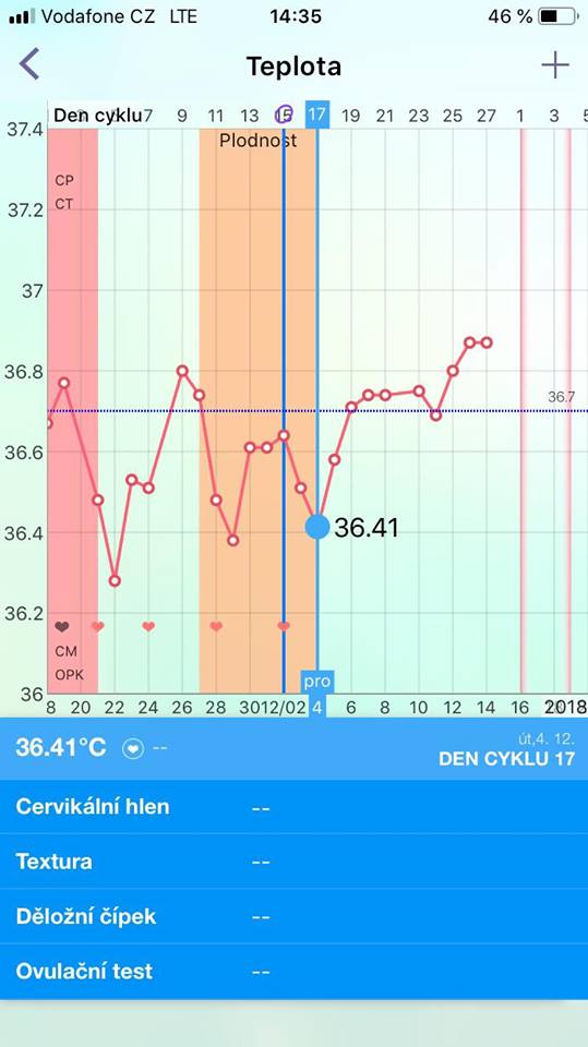 @hermij Vím, že je to poovulační teplota, takže jsem předtím neměřila, ovulaci navíc poznám. A začala jsem měřit až z důvodu různých "příznaků" těhotenství, které normálně nemívám. Myslela, jsem, že teplota poroste a ona klesá, tak asi si to teda namlouvám. Nechám to být a čas ukáže.