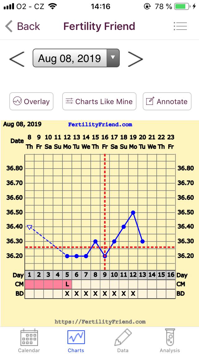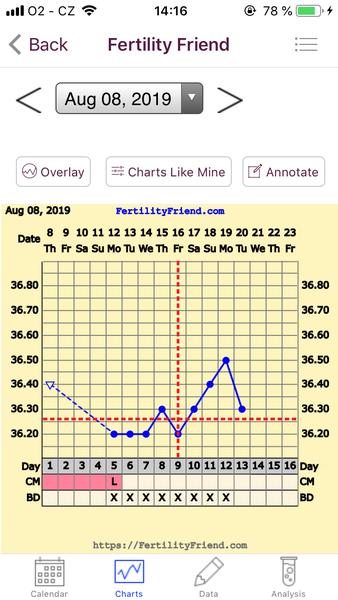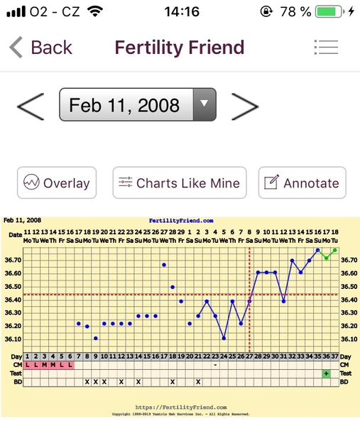 @petula.bir Zkus se ještě měřit dál. Je možné, že bude ovulace v zápětí po MS, ale tento záznam se mi nezdá. Píšeš, že se měříš ve stejnou ranní hodinu každý den, tak uvidíme, jak se dál teploty vyvinou. (Zapisuju na papír, ne do appky, takže neporadím s nastavením.)