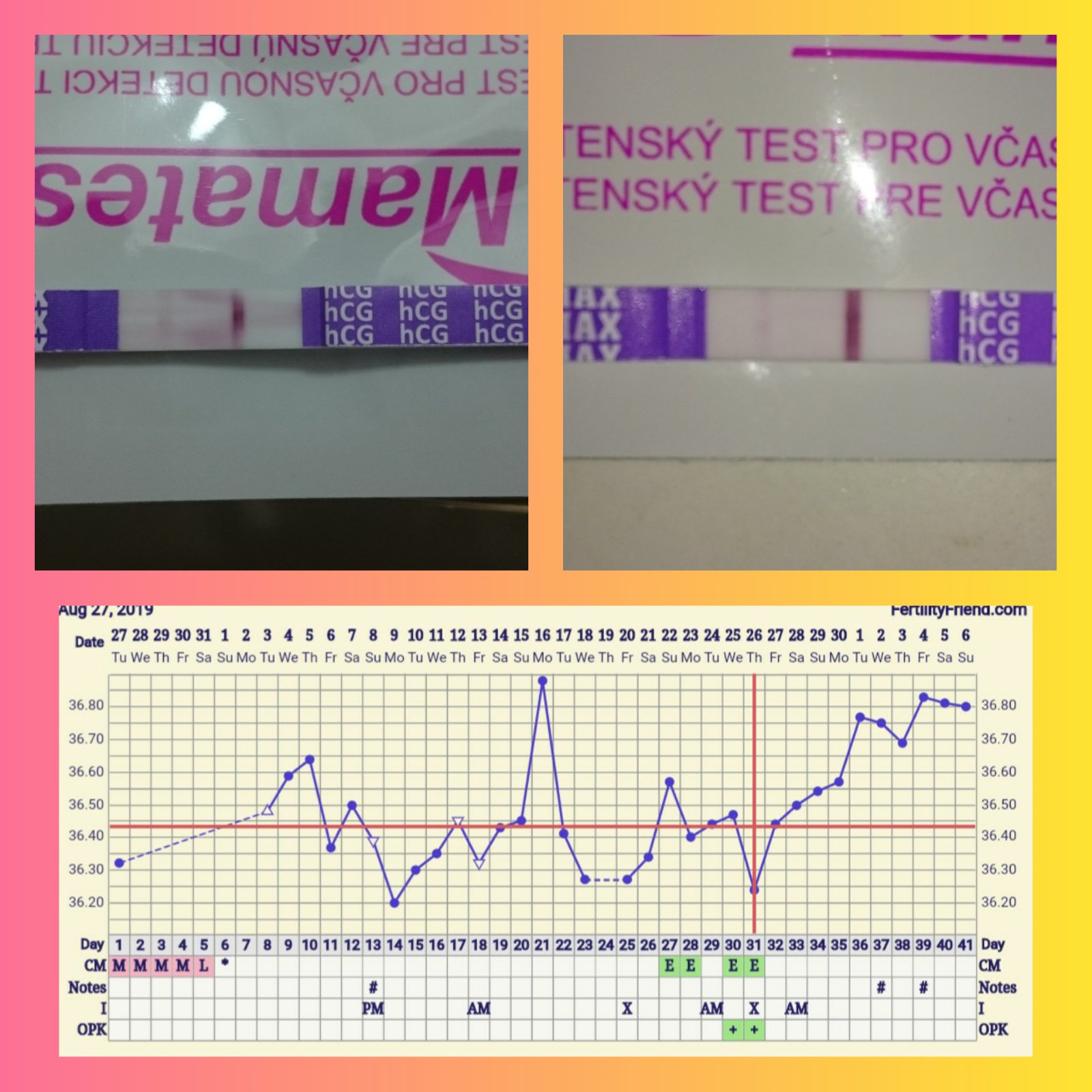 Už kašlu na testy. My jdeme do CAR-u máme to busem jen přes město cca 10-15.mim což je super. Řekla bych, ze pondělí, úterý teplota klesne a přijde ms. Ale je mi špatně od žaludku a prsa bolí.