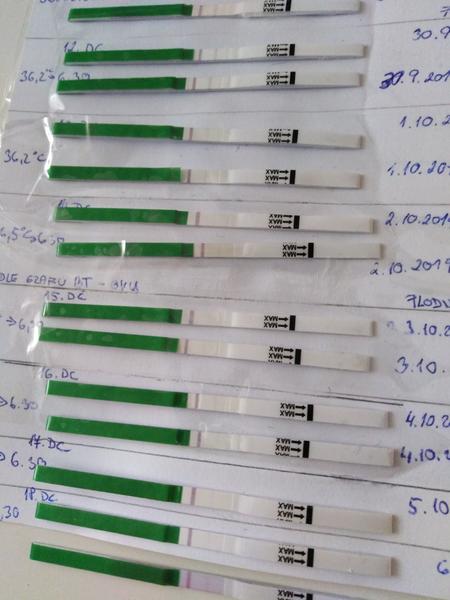 Ahojky, jdu si pro radu jsem 19dc a dnes ráno jsem měla na papíru naruzovely hlen. Bz jsem měla dnes 36,8. Menstruace to být asi ještě nemůže tu mám 27-28dc. Trochu mě poboliva podbrisek ale prsa a další příznaky žádné. Ovu testy vypadají takhle. Poslední je teď udělaný-vím že se má dělat až po 10hodine ale musela jsem vyzkoušet.