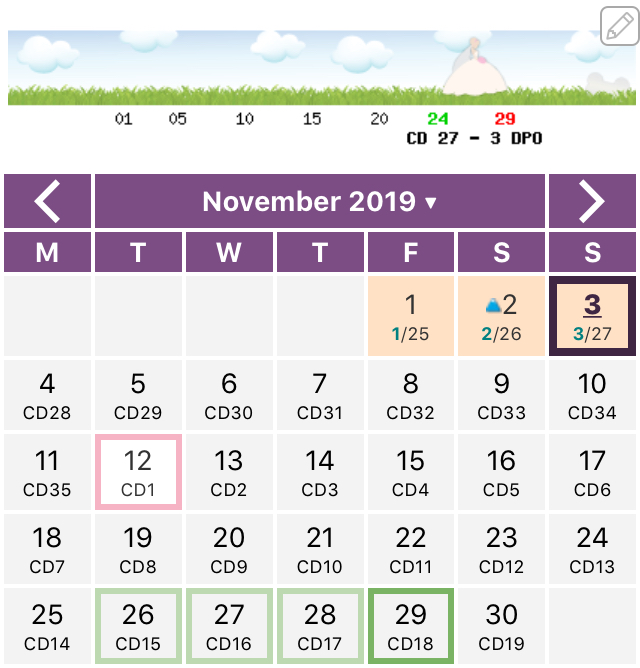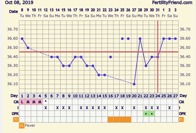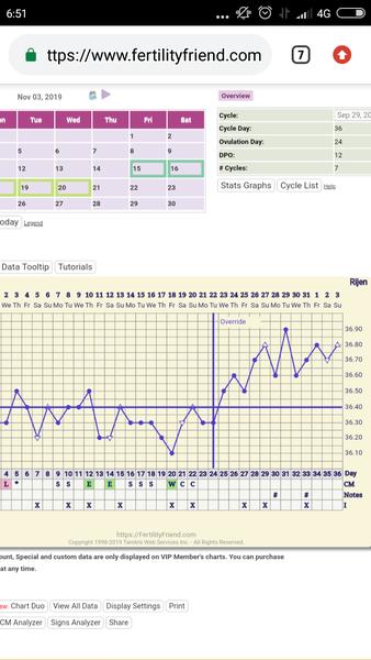 A podařilo se mi ještě nahrát graf, jak to vyhodnocuje aplikace, ale myslím, že pokud by to tak bylo- toho 27dc, tak bych asi ještě neměla ducha, takže myslím, že je správně ta upravená verze tedy ovulace 24dc, jak jste říkaly...