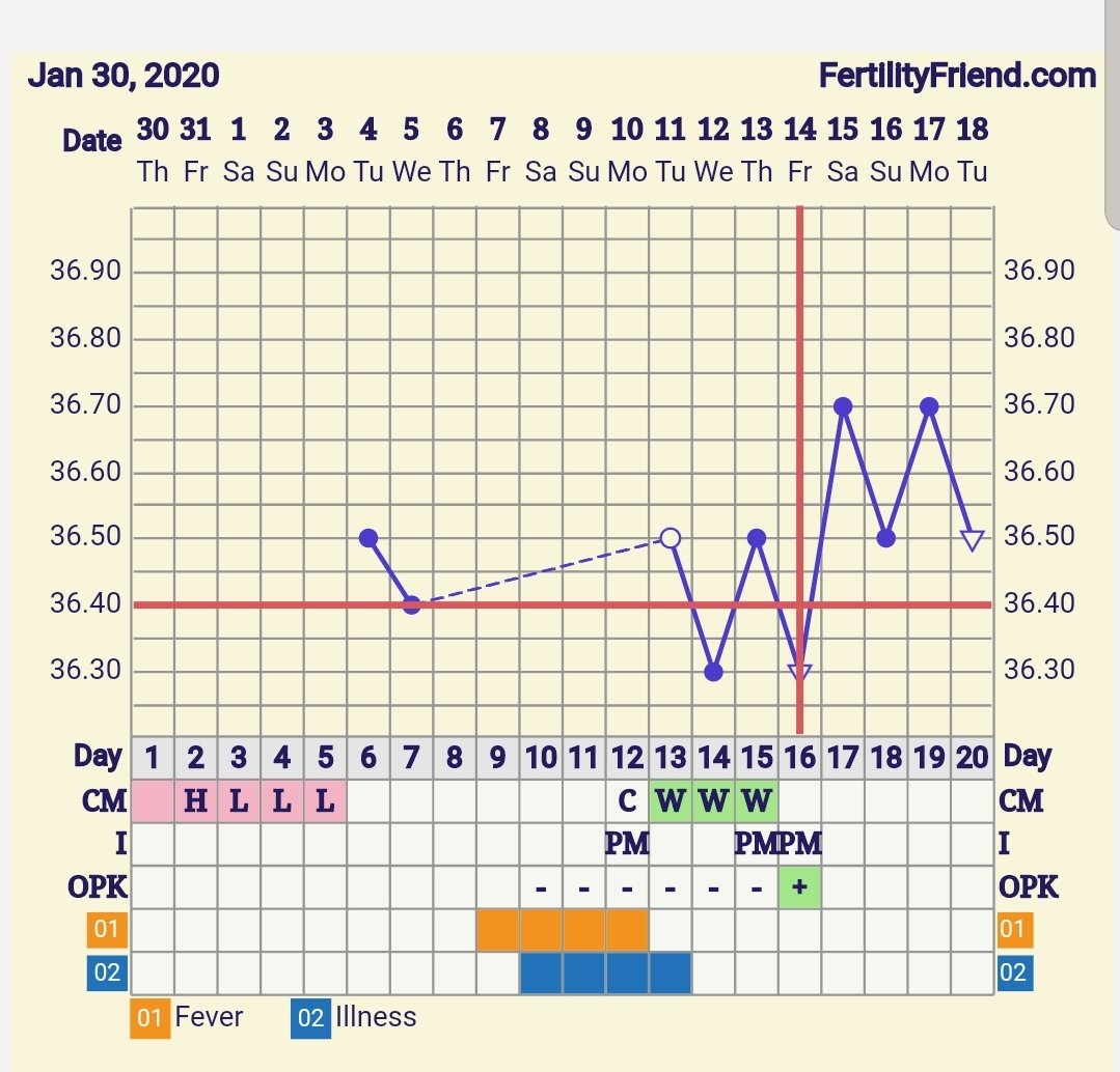 Ahojky, chtěla bych se zeptat na názor, zda podle vás proběhla ovulace, jsem z toho v lese 🙄😂 od 8DC jsem měla horečku, chytila jsem virózu od syna, měla stejný průběh. Od 13DC jsem bez teplot, bez kasle, bez rymy a cítím se fajn. Vzala jsem si během nemoci dovolenou 5 dní a asi poprvé v životě poctivě ležela a léčila se 😂 Dnes jsem měřila o 2 hodiny dříve A nevím jestli to může mít až takový vliv, odpoledne jsem zkusila změřit a měla jsem jako klasický po ovulaci během dne 36,8-37. Jinak mívám během dne od 36,1 do 36,6. Zaráží mě ty skoky tento cyklus...Jinak pozitivní ovulak 16DC byl jasný jak facka..díky za názory 😊😊😊