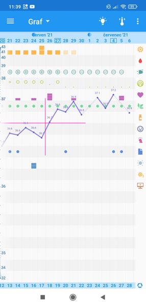 @brambora28 Podle zapsaných hodnot byla ovulace 15. den cyklu (17. dubna). Snad to teda dobře vidím, v týhle aplikaci to moc dobře vidět není. Ovulace obecně nastává, když po 6 nízkých teplotách přijdou 3 teploty vyšší než těch 6. Ovulace je tedy poslední den nízkých teplot. U tebe v grafu je to den předtím, než jsou ty tři stejné teploty. Dobré je k tomu taky sledovat další ukazatele, např. plodný hlen. A taky doporučuju aplikaci Fertilityfriend.