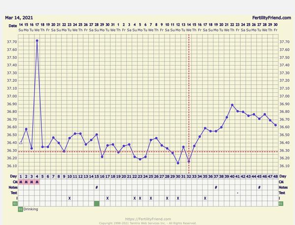 @lucinka225 Není potřeba, aby byla v těhotenství teplota 37. Graf je hezký, třífázový, ale test už by byl pozitivní, kdybys byl 16 dní těhotná. Čekala bych každou chvílí MS, mrzí mě to. Snad se na vás usměje štěstí v příštím cyklu 🍀.