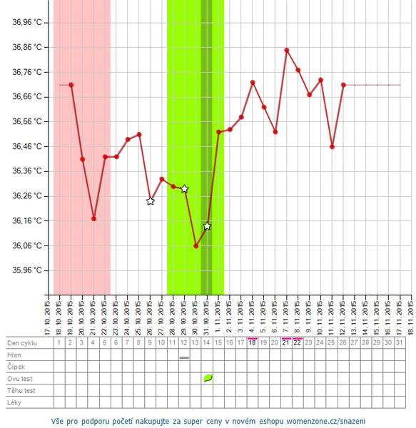 @werumka Tak já nevím, asi tu BT měřím blbě. Možná je to tím, že měřím v puse, tak mi to takhle lítá. Nebo mám blbej teploměr. BTzas stoupla. na ten nidační pokles včera se mi to moc nezdá, byla jsem 11DPO. Zkoušela jsem těhu test a je negativní. Dnes jsem 12DPO. Podle mne zítra začnu špinit. MS by asi měla přijít v sobotou. Normálně mývám cyklus 30 dní, ale teď byla ovu dřív, tak asi i MS bude dřív.