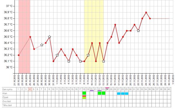 Baby ja sa v tych grafoch vobec nevyznam, neviem si podla toho urcit kedy ovu mam a kedy nie :( Tak podla toho grafu co sem hodila @alzbeta.hod by som povedala, ze mala ovu toho 16.11, ale moj gynekolog ked mi daval kalendarik tak mi prizvukoval, ze ovu mam vtedy ked teplota vystupi o cca +0.5 'C oproti obvyklej a taka teplota sa udrzi dalsich par dni.... Ale mne to tam nikdy par dni nevydrzi tak vysoko, je to ako na hojdacke :(