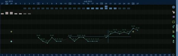 S priatelom sa snazime o babatko od augusta 2012, v marci som sa bola popytat, ci je naozaj vsetko v poriadku (pytala som sa uz aj na preventivke v juni 2012) a lekarka sa rozhodla (kedze mam uz 33rokov), ze mi spravi nejake testy este. Boli mi diagnostikovane polycysticke vajecniky a ako "bonus" aj ureaplasma :(((. Teraz sme po ATB liecbe a cakame na vysledky po 6 tyzdnoch od dobrania. Aby som zatial nestracala cas, zacala som brat tento mesiac aj inofolic a merat si bazalnu teplotu (cca 2dni po menzese) . Prikladam svoj grafik, je mozne ze som mala ovulku na 20 den ? Neviem presne ake zvysenie teploty to ma byt, o kolko stupnov :(