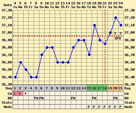 tak a dnes som z toho uplny jelen.. najprv mi na fertilityfriend vyhodnotili cyklus takto a dnes prezmenu takto... posunulo mi to ovulaciu z 11teho na 18ty den...lenze ja od 15teho dna beriem lutenyl, tak si nemyslim, ze by ta ovulacia mala byt prave 18teho... tesila som sa, ze som uz 11DPO a teraz neviem... ☹