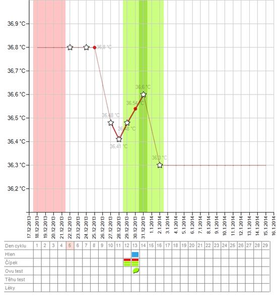 @radus2011 Ahoj 🙂 Dnes je asi deň čudných poklesov 😀 Mne tiež, kukala som ako sprostá na ten teplomer... Ale ja som už 23 DC, síce ja mám uvu dosť neskoro (napr. minulý cyklus až na 22DC). No ale bola som si na 100% istá, že dnes budem vysoko. Hlien mám stále taký ako keby ovulačný, ale to už asi týždeň 😀 A 2 dni mám otvorený kŕčok, no ale vidím, že nič z toho tento cyklus nebude. Vidím to na anovulák, ale kašlem na to 😠 Držím palce nech Ti zajtra teplota vybehne hore. Pripájam môj "krásny graf" http://www.womenzone.cz/uzivatelka/donatela/gra...