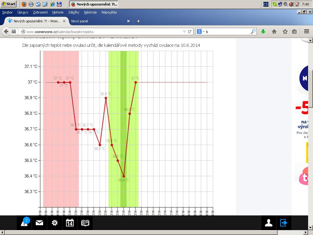 Ahoj, jen tak pro zajímavost jsem si zkoušela dělat graf bazální teploty. Ovulaci na sobě jinak docela dobře poznám a vím, že byla včera (11.6.). Jen nerozumím tomu, proč mi ten graf pořád tvrdí, že podle teplot nemůže ovulaci rozpoznat a že podle kalendáře vychází na 10.6. Podle mě je tam rozdíl teplot docela slušný,ne? Nebo jsou tam ještě jiná pravidla? Nějak tomu nerozumím... A podle toho grafu by vám přišlo, že byla toho 10.6. nebo jak si myslím já 11.6.?? Díky za rady