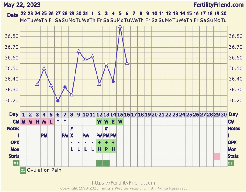 Měla jsem hojný hlen, bolesti břicha, dokonce jsem 11 dc zašpinila. Ale teplota dnes (možná 3 DPO) není nahoře 🙄. Dala bych za tu ovulaci skoro ruku do ohně. Kdybych měla dnes 36.7, tak mi ji vyznačí plnou čarou, ale 36.6 a nic 🤷