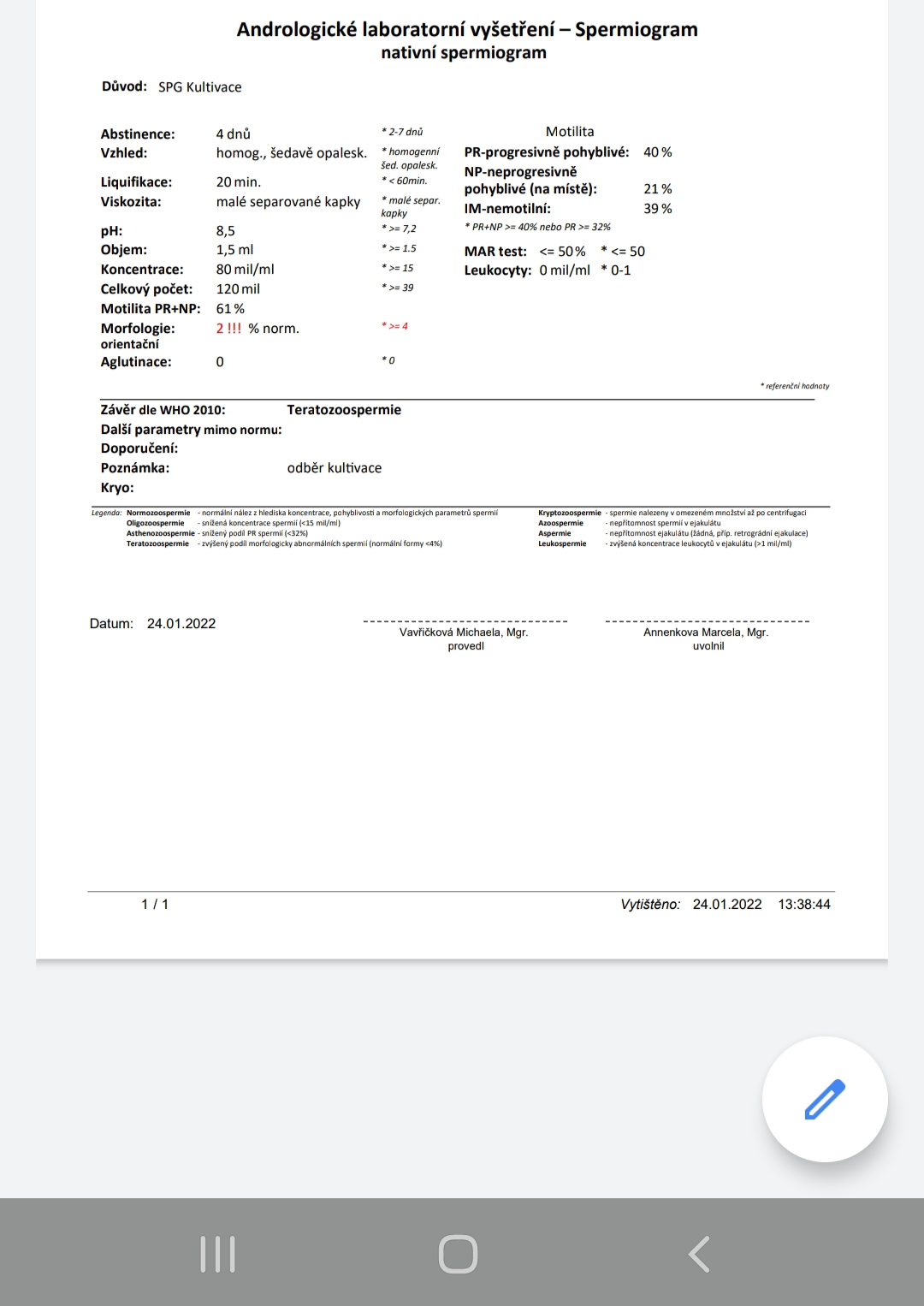 @sellynka2 Není to tak špatné, koncentrace je super, měla by být aspoň 15 mil/ml, máte 80. Pohyblivost je taky v pořádku, jen morfologie je pod hranicí normy, ve vzorku bylo jen 2 % spermií se správným tvarem, měly by být aspoň 4 %, aby se to považovalo za normu. Jediná morfologie může být ale trochu subjektivní, protože to posuzuje pracovník pohledem.