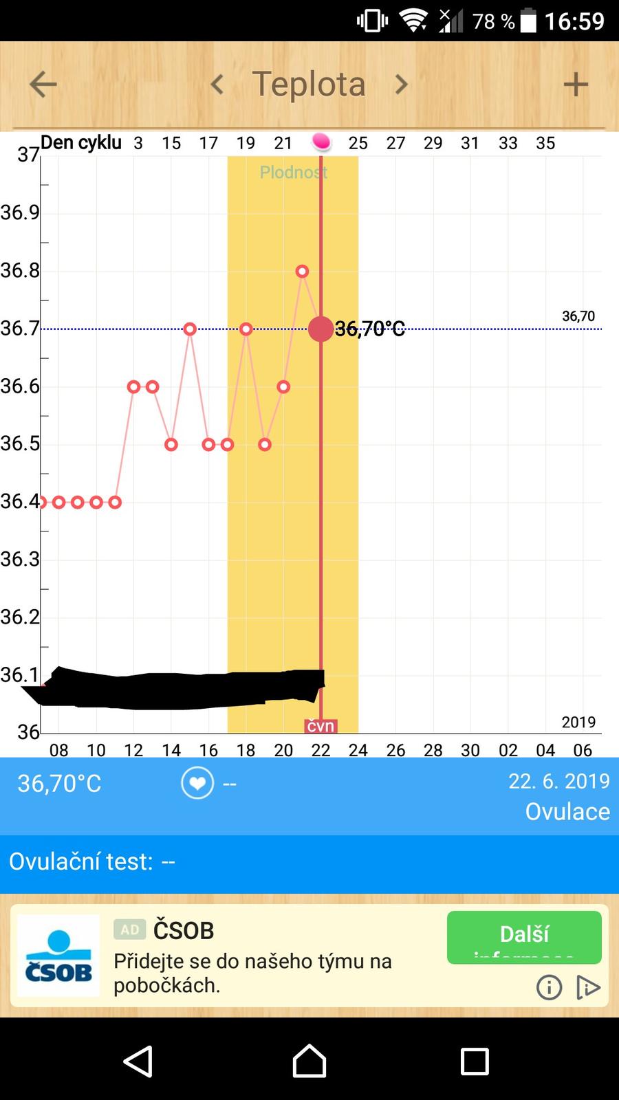Zdravim, s manzelem se snazime pul roku o miminko. Delala jsem do ted testy ovulacni jenze ted mi test neukazal pozitivni vysledek, prvne jsem si merila i teplotu a potřebovala bych se zorientovat v grafu, pomuze mi nekdo? Jsem v tom opravdu zacatecnik, me vychazo ovulace podle grafu 21 den, ale jista si nejsem. Jinak dalsi hodnota byla 36,8. A prvni ctyri dny jsem nemerila. Predem dekuji
