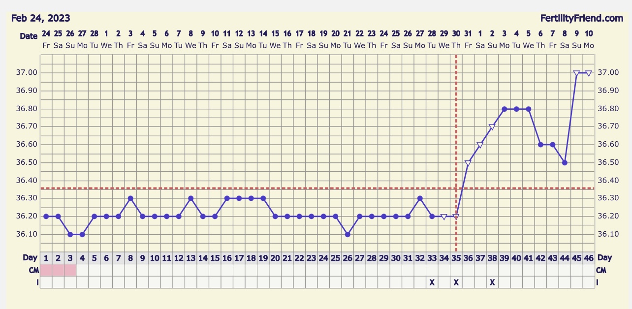 @ell94 co bys rada vysvetlila? ovulace pokud vidim spravne byla den 35. nyni jsi 46, to je 11 DPO. jinak normalni 🤷🏼♀️ pokud byl sex, jak jsou krizky, je mozne, ze se ti 9 DPO podarilo zachytit tzv. nidacni pokles teploty. nevim, jak mas obvykle dlouhou lutealni fazi, ale pokud by 9DPO bylo zahnizdeni, mohl by byt na testu uz duch, protoze uz by dochazelo k vylucovani hcg. tomu by odpovidala i ta teplota kolem 37. pokud neklesne, budes mit krasnou trojfazovou tehotenskou krivku ☺️👍 ale to se teprve vse uvidi, to je jen hypoteticky.