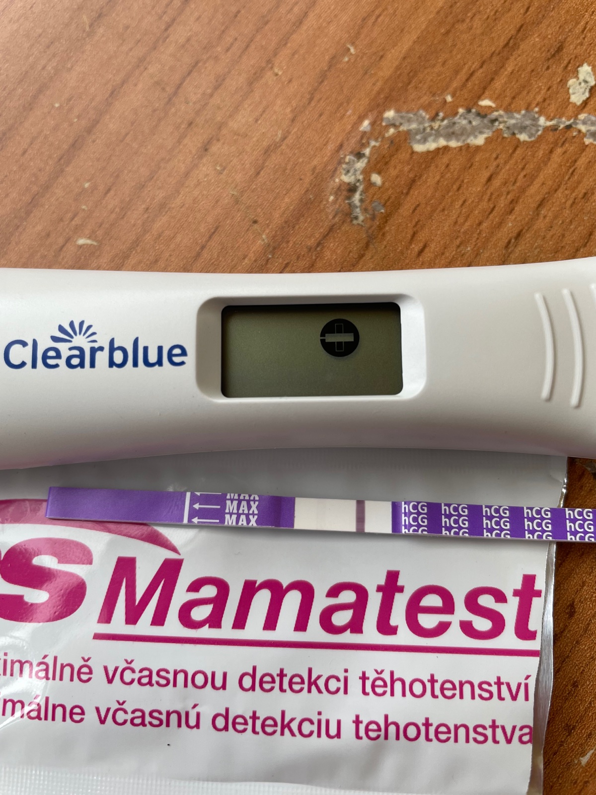 Ahooj, jdu na vás s dotazem na těhotenské testy. Snažíme se o miminko. Dnes jsem si dělala test z ranní moči Mamatest a vyšla slabá čárka, tak jsem jela koupit Clearblue digitální a vyšel negativní. Přidám foto..