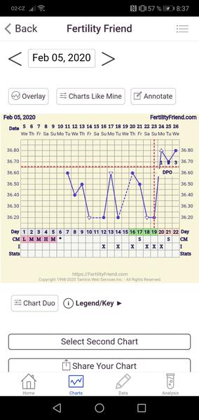 Ahoj, můžete mi prosím poradit s mým grafem? Tento cyklus poprvé měřim bt vždy v rozmezí 7:30-8:30 ráno, než vylezu z postele. Ovulační testy jsem dělala, celý týden, pěkně sílily až do pátku kdy byl test už skoro pozitivní, ale v sobotu už zase slabý duch a dále už bílo. Nechápu z toho grafu, nevím, jestli ovulace teprve bude, nebo byla opravdu ta grafem vyznačená, nebo už je jasné, že cyklus je anovulační...? Ten 15dc jsem bohužel měřila až 9:30, takže je to nepřesné. Moc děkuji za každý názor a radu.
