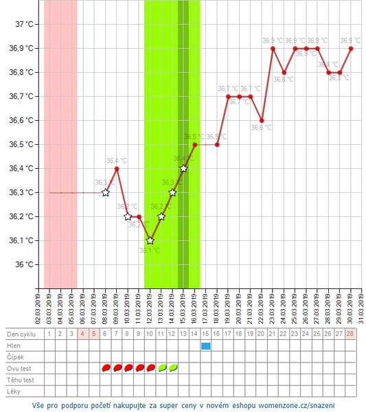 @ellena24 Kdy jsi ho začala brát? Gynex obsahuje směs bylin, které spolu "nějak" působí. Mnohé z těch bylin působí jako fytoestrogeny, sice potřebujeme, aby nám estrogen fungoval, ale když je ho moc, tak to může způsobit, že se ovulace oddálí, anebo dokonce neproběhne. Zdravá žena nepotřebuje užívat byliny. Na tomto záznamu ukazuješ krásný zdravý cyklus, s ovulací mezi 13.-14. dnem cyklu. Luteální fáze 15 dní, což je famózní. Velká škoda, že se nezadařilo. Před ovulací máš docela nízké teploty, taky MS je krátká, píšeš, že i slabá, takže možná, že zrovna u Tebe ten Gynex nevadí, třeba podpoří větší nárůst děložní sliznice. Ale raději pokračuj se sledováním, kdyby se něco změnilo, tak ho vysaď. Inofolic je jenom vstřebatelná kyselina listová, raději doporučuji přípravky jako Chytré miminko, Superfolin, Femibion... kde je zároveň více vitaminů a minerálů. Ale už i ta B9 je hodně důležitá pro průběh cyklu. Plodnost podporuje hodně i vit. B6 (nutno pro vstřebávání užívat s hořčíkem). Mimo ženské byliny podporuje nárůst děložní sliznice a ovulaci mateří kašička. Buďto přímo od včelaře, někde v bio kvalitě, nebo třeba v přípravku Sarapis Plus+ (ano, na obalu je psáno pro ženy v klimakteriu, ale jde o složení, ne co píšou na obalu :D ). Krásný záznam, ať se zadaří 🙂