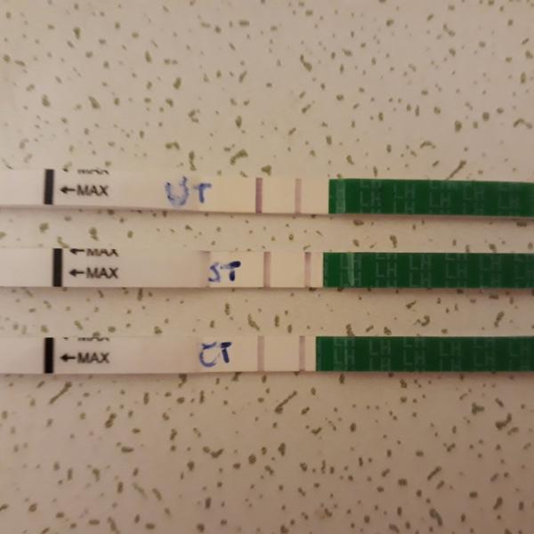 Mohu ho brát za pozitivní? Čárka je o chlup slabší než kontrolní. Ovu. bolesti mám. Přikládám fotku.😊