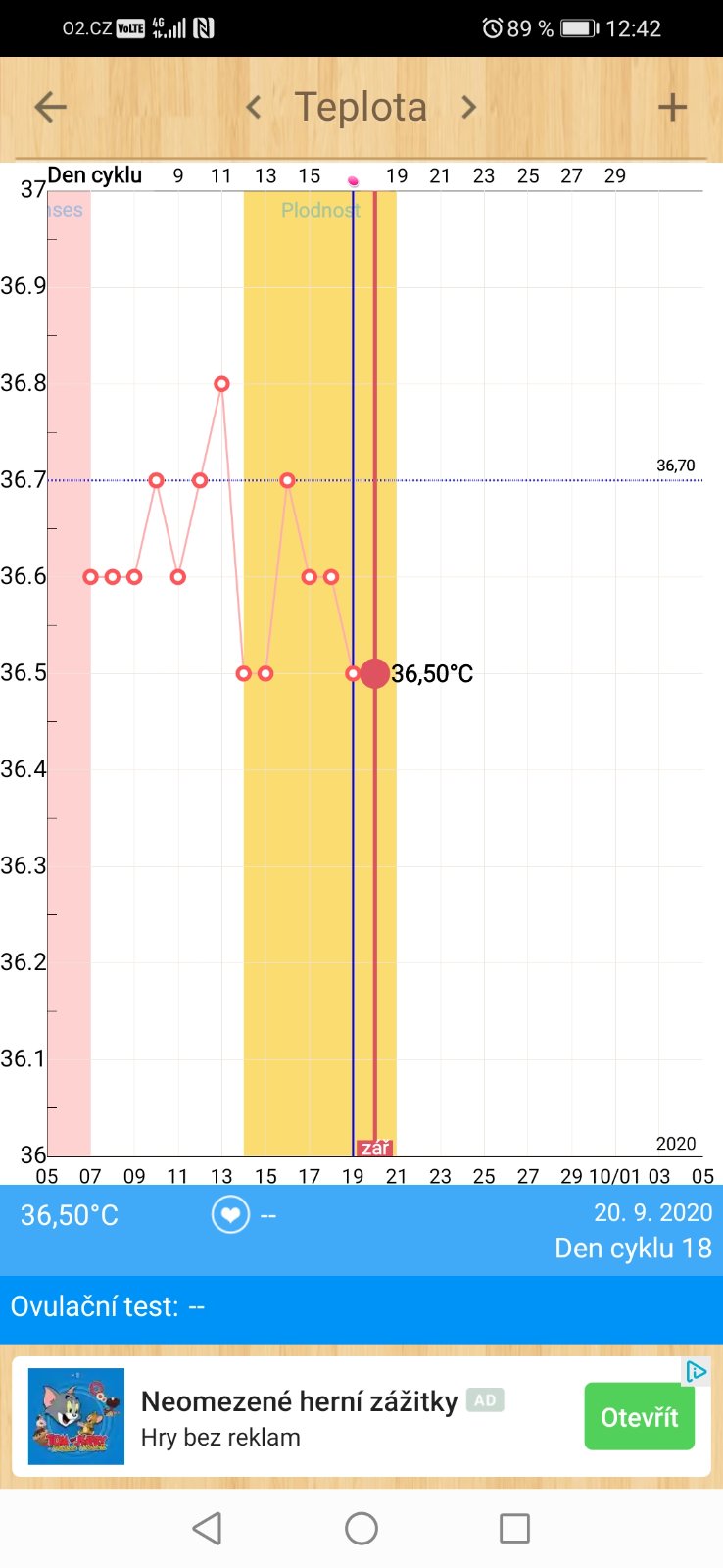 Zdravím, dřív jsem neměla trpělivost s měřením bazální teploty, ale po 10 měsících jsem to vydržela. Jenže ta moje teplota je jaksi rozházená a nevím zda proběhla. Cyklus mám 30 dní a podle kalendáře jen tak orientačně bych měla mít ovulaci 19.9, ale 3 dny před ovulaci 16.9 jsem měla hodně táhlý hlen byl spíš zakalený než průhledný a nešel přehlídnout. V ten předpokládané ovulace toho 19.9 jsem měla taky táhly hlen, ale průhledný a měla jsem velké mokro v kalhotkách . Nějak věřím, že ta ovulace byla, protože trpím na akné a v době plodných dnů jsem neměla vůbec žádné měla sem i větší prsa což mám ještě i teď. Mírné bolesti na levém vaječníku. Dám sem i foto grafu a snad mi někdo pořadí. Děkuji