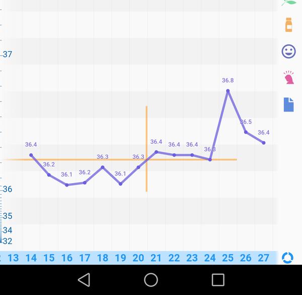 Ovulace u tebe byla asi 24 dc, sice ty teploty nejsou moc vysoké, ale délce cyklu by to odpovídalo 🙂