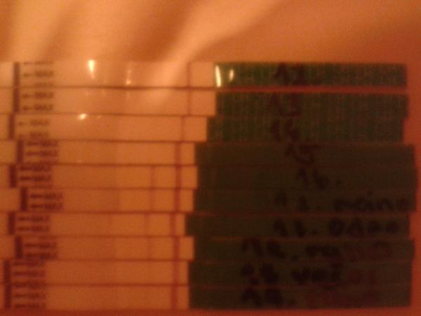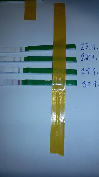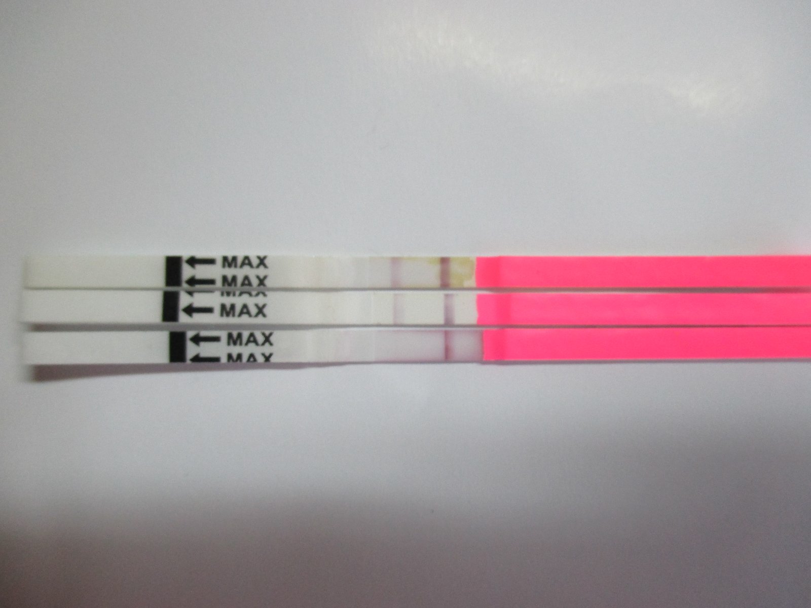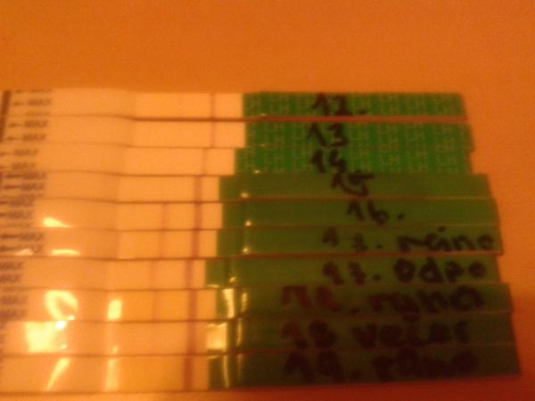 tak u mě pozitivní ovu test vypadá takto 🙂 vrchní je s včerejšího odpolka,prostřední je s včerejšího večera a ten spodní je dnešní.naživo ty čárky ze včerejška jsou daleko výraznější.a ten samotný je dnešní.