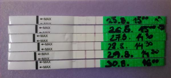 Holky, tak já dnes takto..kdybych se testovala až dnes, tak bych řekla, že je pozitivní. Čárky stejně syté. Takže to ještě nepřišlo/ neodešlo ? 😀 ..nejsem z toho moc moudrá...čekala jsem úplnou bleduli ...