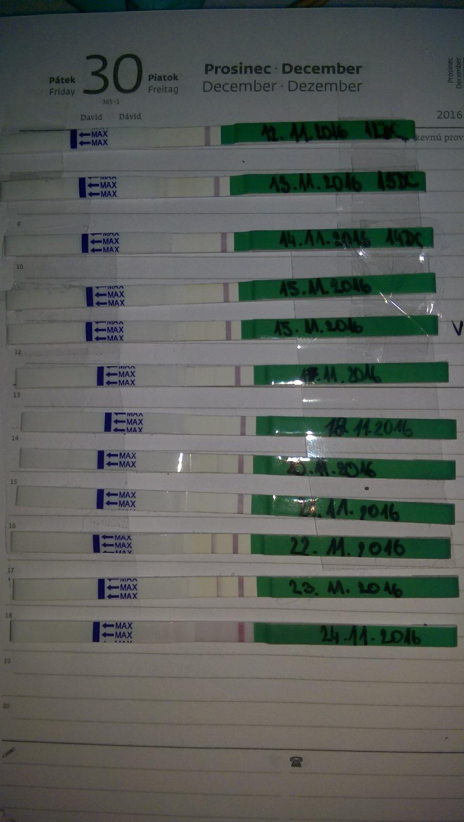 @petrakreml Ahoj,u testů Dr.Max se spousta holek ani nedočká pozitivního testu 😉 Ale když se podívám,že 23.11. už byla čárka zase slabší a ve dnech do 21.11. vyloženě nic,řekla bych,že toho 22.11. byl pozitivní test. (poslední je focený ještě před zaschnutím) 😉