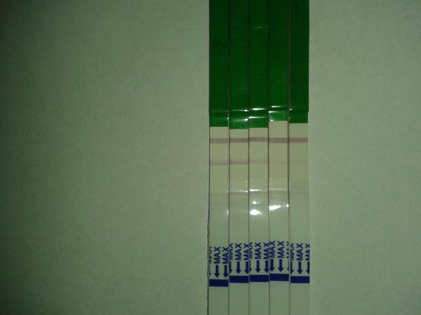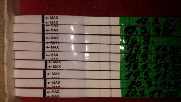 z leva první dva jsou dělané v sobotu 15.3 a to sjem neměla v plánu testovat ale měla jsou hroznou bolest v levém vaječníku tak jsem si jela koupit ovu test dojela jsem domů, s manželem jsme se tulinkovali a v 16 hod jsem si dělala testík a hned se tam ukázalasilná čárka (sice není jako kontrolní ale co jsem dělala testy před 3 měsíci tak je nejsilnější) no pak večer asi ve 20 hod jsem udělala ještě jeden o malinko je silnější no a na druhý den už slábne tj v neděli v pondělí a dnešní se objevila až skoro po 5ti minutách a je slabounká