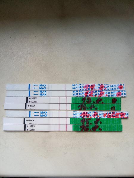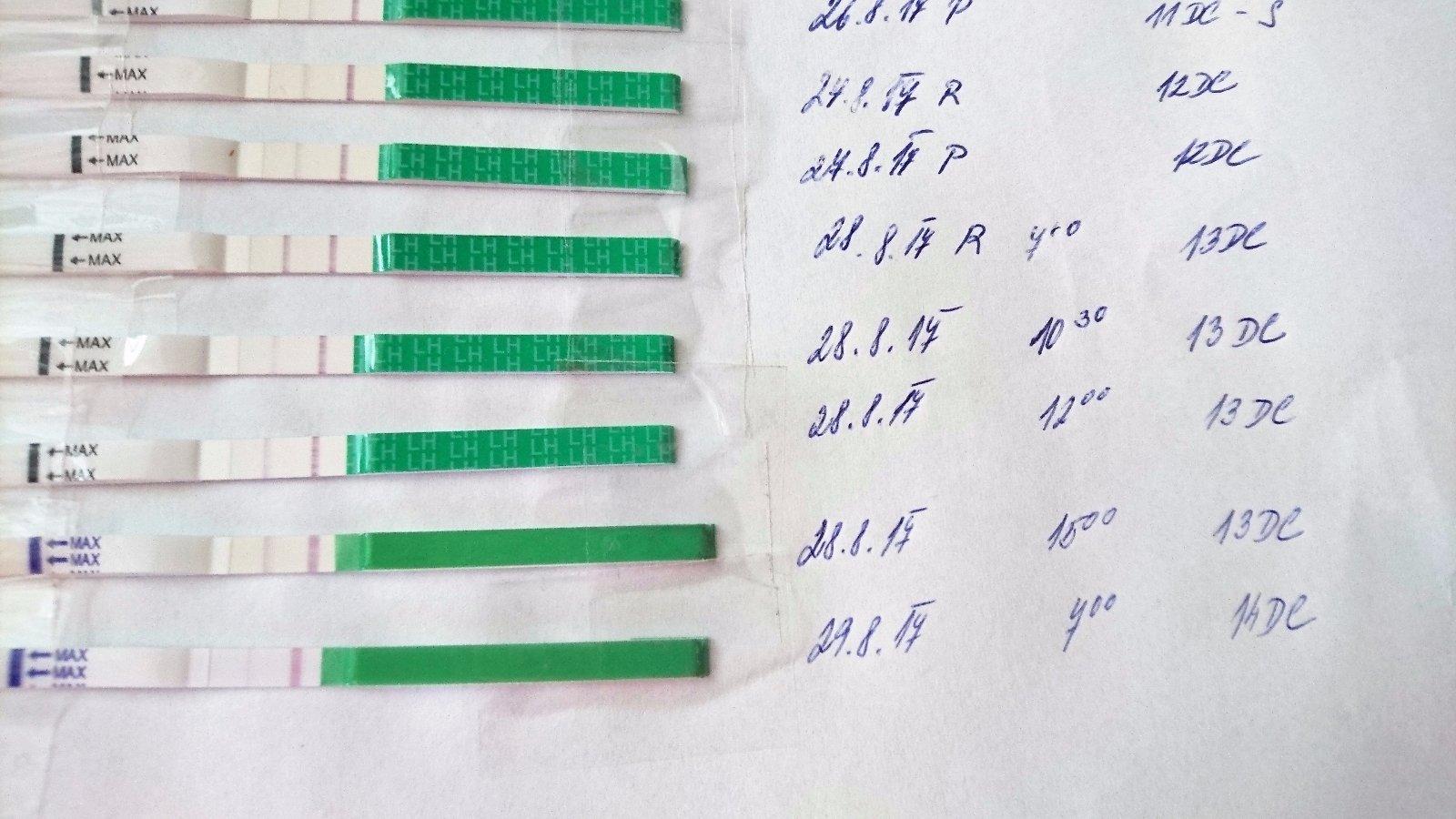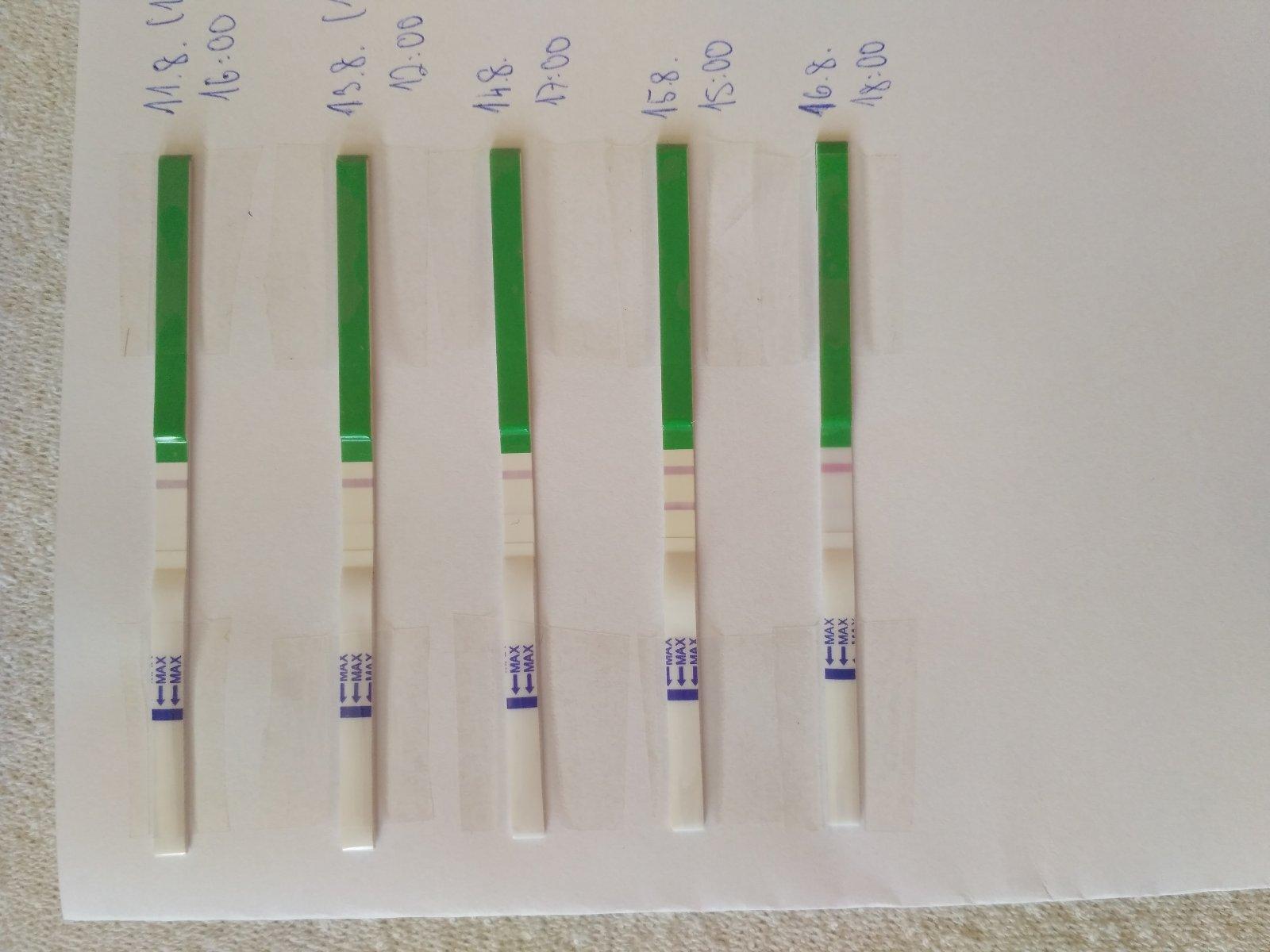 Posílám fotku ovulačních testů. Včera v poledne ještě pozitivní nebyl. Ale dneska ráno v 7h bych řekla, že už jo (nebo ne?). Nedalo mi to a dělala jsem v 10h další. A ten už zase pozitivní nebyl. To je jako možných, že bych během těch tří hodiny odovulovala a ještě stihla klesnout hladina LH? Jsem z toho jelen ☹