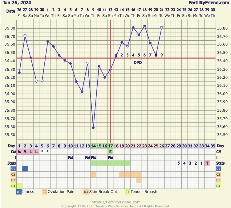 Pokles BT v polovině luteální fáze. Máte některá taky? Nidace?