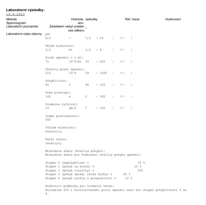 @dolvini referencni hodnoty jsou * tedy v ramci hodnot pro ok. Aby byl nalez normalni tak 25% spermii musi mit pohyblivost 3 a 4 a tady je 30% z toho vychazi normalni nalez.