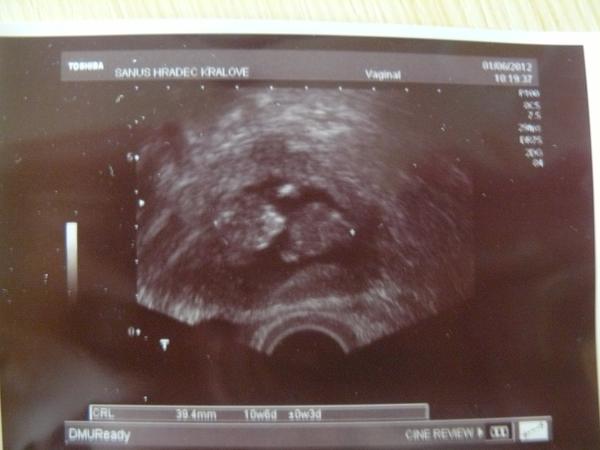 Ahojte holky, tak jsem byla dnes v HK v Sanusu, byl semnou můj miláček. Z prvu se začal zdráhat, že nepůjde dovnitř, ale pak šel jinej tatínek a tak se taky osmnělil. Dnes byl UTZ jen na zjištění velikosti miminka, aby nás objednali už přesně na NT screeneng na 14.6., ale i tak nám pan doktor ukázal monitor oběma a miminko na nás mávalo obouma ručičkama a kopalo nožičkama 😀 Ukázal jak mu tluče srdíčko, no byla to nádhera, i manžel pak když jsem šla ještě zaplatit a na krev, se rozplíval nad fotečkou v čekárně 😀 Jinak miminko to nakonec dohnalo asi, a nebo je samozřejmě kvalitnější UTZ a vycházíme na TP 22.12., tedy dnes 10+6 a od minulé středy jsme povyrostli o 1,4cm. Tak ještě aby to hlavně příště bylo všechno OK 🙂