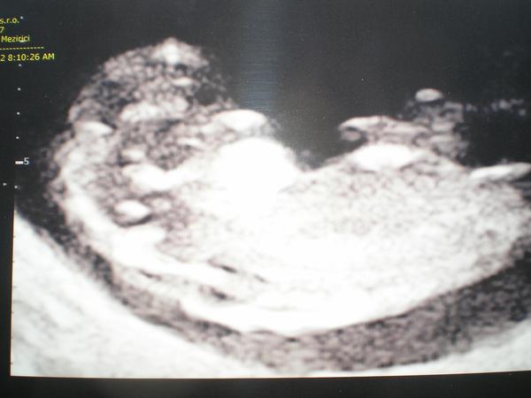 Dobré ráno, holky. Včera jsem se celý den nedostala k pc, protože muž si ho vzal do práce 😒 tak jsem ani nemohla dát vědět, jak dopadla kontrola. Dneska končíme 11.tt, datum porodu se nám posunulo na 29.6. Byla jsem zase vyklepaná jak ratlík, ale dr. byl moc hodný, prohlížel podrobně ult celé miminko, znovu se díval na ručičky, nožičky, měřil NT a dámy!! máme ho 1,4 😵 😵 😵 takže úplně v normě (minule touhle dobou bylo NT 5,4 ☹ ). Dokonce říkal, že to vypadá, že se pomalu rýsuje nosní kůstka, kterou u předchozího miminka nenašli, tak jsem si vážně oddechla, i když ještě nemáme vyhráno.. Vzali mi krev na screening a pohl.nemoci - brrr 😖 a 20.12.jdeme na ult K Polákovi, který řekne co a jak. V 16tt mi budou dělat další testy, jejichž výsledky se budou kombinovat se screeningem a ve 20tt pak klasicky velký ult a kardio. Jestli ještě budou nějaké další testy, nevím, to nám řekne až Polák. Přidávám fotečku našeho 38mm velkého budulínka 🙂 Začínám se potichoučku těšit, že snad budeme mít zdravé miminko.. 😕