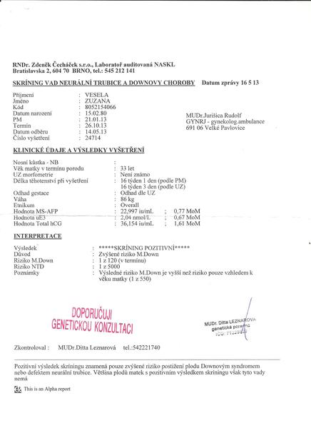 @maximka33 zvýšené riziko M,DOwn, 1 z 120 v termínu riziko M.Down , 1 z 5000 riziko NTD, výsledné riziko M .Down je vyšší než riziko pouze vzhledem k věku matky 1 z 550