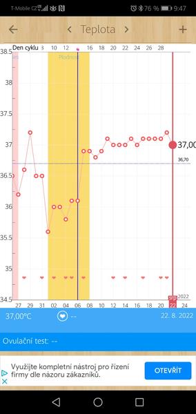 @elen29 Teplota stále roste, takže je před ovulaci. Jak dlouho ukáží další teploty. Pokud ale chceš jistotu,kdy ovulace bude, dělej i ovu testy. Bohužel u teploty tu ovulaci ,pokud žena neví při jaké teplotě ji má, zachytí graf az po nebo s koncem ovulace. Já osobně měla ovulaci vždy v momentě rapidního poklesu po vzestupu teplot.