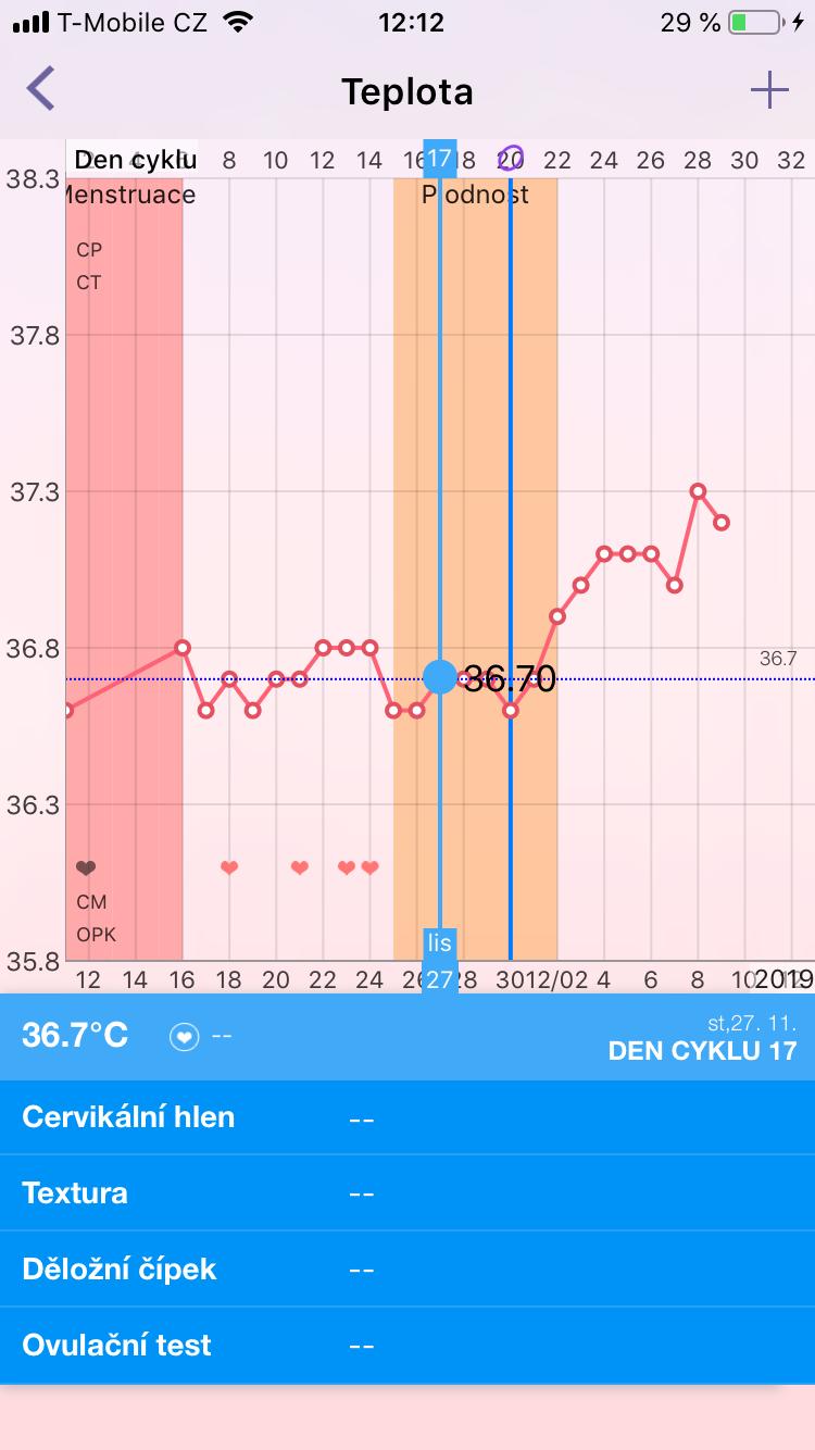 Taky se ráda připojím. Snažíme se už přes rok a zatím nic. Řekla by mi některá z Vás zkušenější názor? Ovulace potvrzena u Dr, 29.11 mi píchli Ovitrelle, snažili jsme se v sobotu večer a neděli dopo dle jejich rady. Přikládám i graf BT. Před 2 dny jsem zkoušela tt byl tam duch (ale to byl ještě asi vliv Ovitrellu) dneska tt negativní. Dneska a včera mě popichává v podbřišku. Je ještě šance, nebo myslíte, že je to spíš na ms? 😊