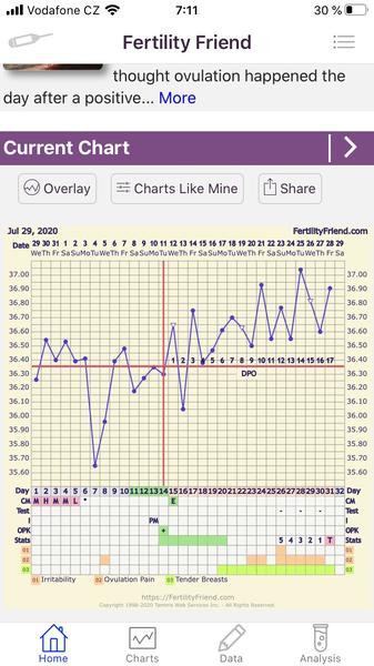 No teplota vypadá velice dobře ani žádný výrazný pokles,ovulace vypadá dobre označená je. Pokud vidím jsi 14 DPO to už by měl být náznak na testu....