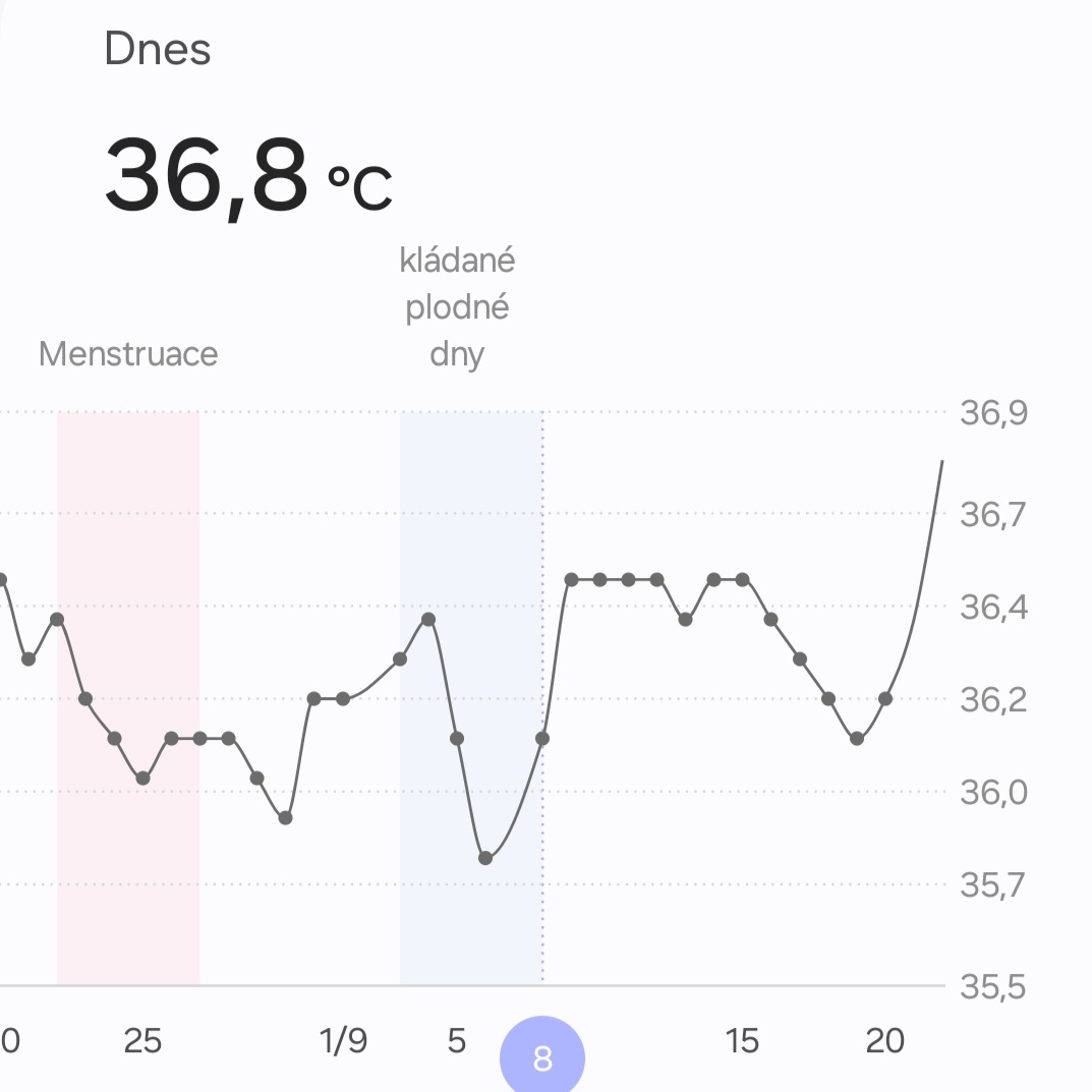 Zdravím slečny/paní. Mám otázku a nikde jsem nenašla odpověď. S přítelem se snažíme už asi 2 roky,ani pokusy s medicínou nevyšly a tak už jsme to vzdala. Ale dnes měla přijít ms a místo toho se mi zvýšila bazálni teplota. Mívám ji nízkou,ale nějak nerozumím tomu,že dnes takto vyrostla. Přikládám graf. Díky za odpovědi