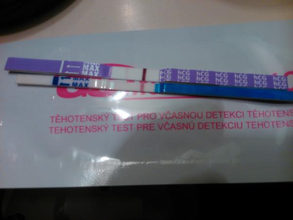 I když jsem si to zakázala, tak přesto jsem se dopoledne rozhodla k jedné věci, donutila mě k tomu jedna situace. Předem chci všem říct, že už jedno dítě mám, a nyní se o druhé snažíme teprv měsíc, a ani nepředpokládám, že by se tak mohlo brzy zadařit. Ale vzhledem k tomu, že mi už mešká asi cca 8den menstruace, tak jsem si toto pondělí dělala test (to je ten první na fotce), dnes jsem byla na gynekologii a na ultrazvuku nešlo nic vidět, takže jsem vyfasovala injekci do zadku (vyvolávačku – agolutin) a že by měla mrcha cca do 14dnů dojít, když ne, tak budu s největší pravděpodobností těhotná. Když jsem se dotazovala doktora na duchy, kteří se rádi objevují na TT, tak mi odpověděl, že ty papírkové testy to hodně dělají a že se jedná o rozpitou barvu. Říkám si ok, tak jsem asi jedna z těch, co se to rozpilo a že tedy vyčkám, co bude. Ale vzhledem k tomu, že bych od rána jen jedla a jedla a to i čokoládku, kterou normálně moc nemusím, tak si říkám, že když už jsem se tu jednou dotazovala a hledala tu odpověďi na moje otázky a nenašla pořádně to, co jsem chtěla, tak jsem se rozhodla, že si udělám znovu TEST (ten druhý/spodní na té fotce) a to i z dopolední moči, říkám si, tak jsem zvědavá, jestli se nám to opět rozpije nebo ne. no a na fotce máte výsledek. Tímto se Vás neptám, co myslíte, jestli ano nebo ne. Chci spíš všem snažilkám i těm budoucím poukázat, co můžou dělat testy, i když třeba těhotné nejste. Samozřejmě sem i napíšu, až budu vědět, zda-li těhotná jsem nebo mi dorazila mrcha. Omlouvám se za dlouhý příspěvěk.