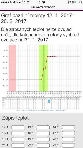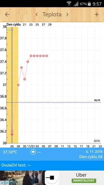 Jj, trochu to skákalo, i když jsem se snažila měřit ve stejnou dobu po stejné délce spánku 🙂 Někde jsem myslím četla, že když teplota přetrvává ve vyšších hodnotách 16 dní a víc, tak že je velká pravděpodobnost, že se povedlo, takže o Tvém grafu si myslím, že pokud teploty vydrží do středy, tak bys mohla pomalu zkoušet test 😉 Držím palce!
