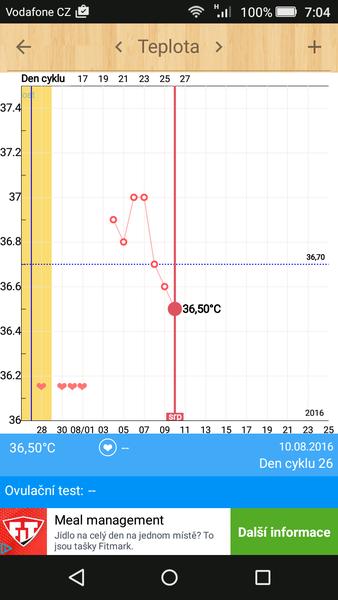 Ahoj holky, rozhodla jsem se, ze si budu zapisovat uz jen BT a nic vic abych se z tohi nezblaznila:(. Vim, ze musim merit aspon dva cykly abych zjistila jake mam teploty, ale presto mi to neda. Merim par dni a bt rapidne klesá pred ocekavanou ms. Je to normalni o tolik? Jinak cca 5 dni pred ms vzdy spinim, coz prave probiha.