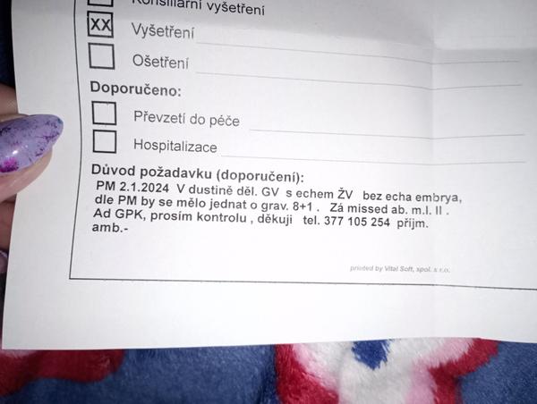 Stav: v dutině děložní žloutkový vak bez srdeční akce embrya, podezření na zamlklé těhotenství (když gravidita neodpovídá 8+1); dále někdo dovysvětlí.