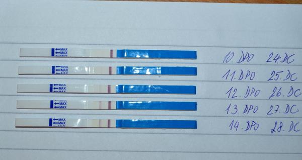 1. těhotenství 10DPO (28DC) slaboučký duch , ale na 25 testu, 12DPO(30DC-2dny před MS) už krásná čárka