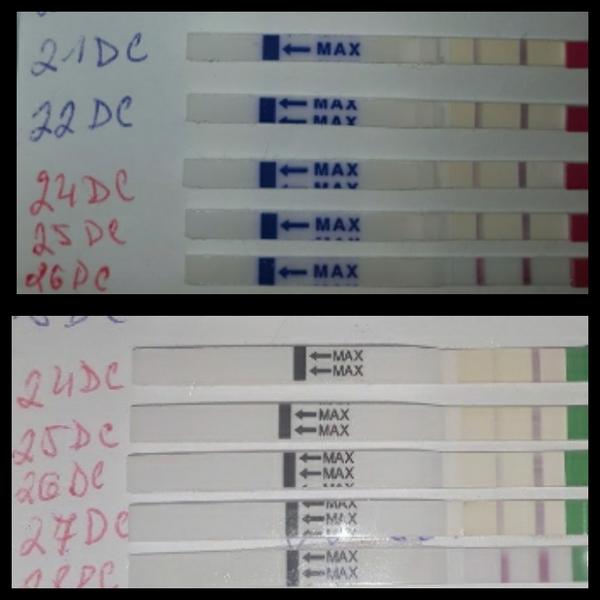 Testované v jednom dni...čemu věřit? Jsem 9 DPO...sledováno delší ranní bazální teplotou ( 5 měsíců ) , hlenem a kalkulačkou..