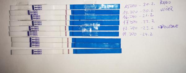 (poslední test jsem dělala dnes před obědem. Poslední 3 jsou tedy 20,22 a 23dpo)